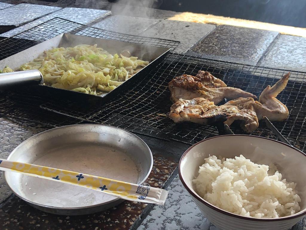 除了烤半雞之外,搭配的雞肉炒青菜也是一絕,店家會先炒好雞肉和菜,然後放把整盤放在炭爐上,即使外面是冰天雪地,菜餚仍是在最好的熱度之中,同時奉有白米飯和飲品,雖然簡單,但吃到的每一口食物,都有美味幸福的滿足感。