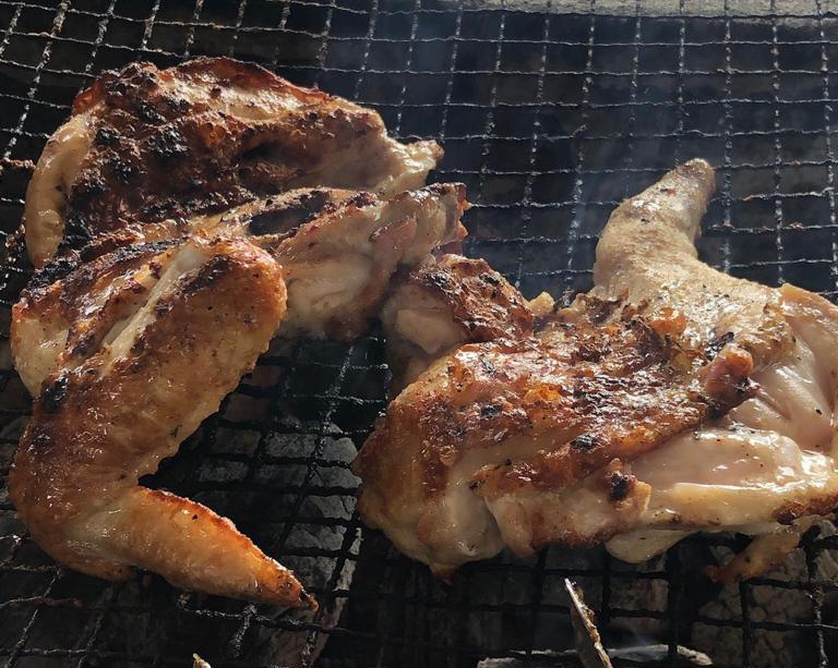 Higashichitose barbecue 主打單一道炭火烤半雞,配有雞肉炒青菜、白飯,日文菜單就寫在木板,掛在上方,這是傳統日式食店的風格,當大家就坐並點好餐之後,廚師們就會即席在你面前以炭火烤製鮮雞,粉色的雞肉灑上調味料,再經過炭火慢烤成白嫩並帶焦香,一道色、香、味俱全的美食,馬上呈現出來。