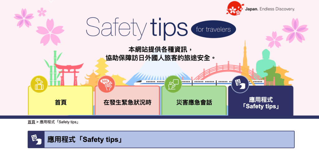 如果你準備出發前往日本旅行,可以在到達當到之後,下載這款名為《SAFETY TIPS》的手機應用程式,而根據日本觀光局網站資料顯示,這個程式提供推播通知,提供有關地震速報、海嘯警報與其他日本國內氣象警報等警戒,而程式可選擇中文(繁體/簡體)、英語、日語、韓語、西班牙語、葡萄牙語、泰語、印尼語、越南語等多國的語言,即使不懂日文也都可以使用。